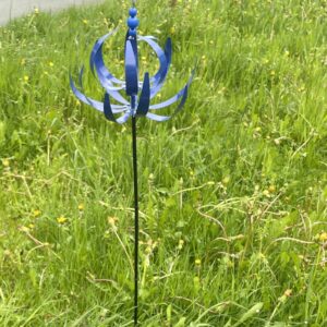 Garten Stecker Höhe 97 cm oberer Durchmesser 19 cm Windspiel schwarzes Metall mit blauen Drehblätter bei Wind rotierend