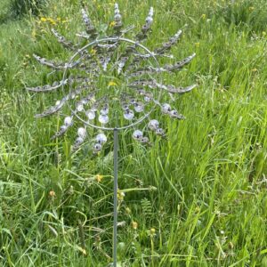 Garten Stecker Höhe 97 cm oberer Durchmesser 30 cm Windspiel silbernes Metall mit silberne Drehblätter Blume bei Wind bewegend