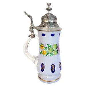 Antiker Glaskrug Überfang Emaile Henkelkrug mit Zinndeckel mundgeblasen und handgeschliffen Höhe ca. 26,5 cm – Blau weiß