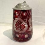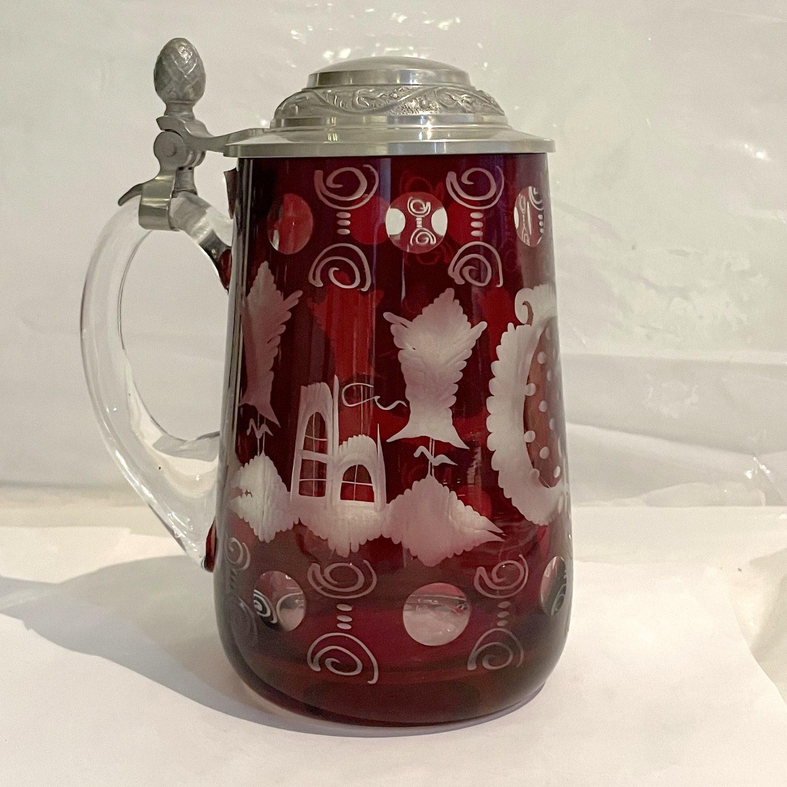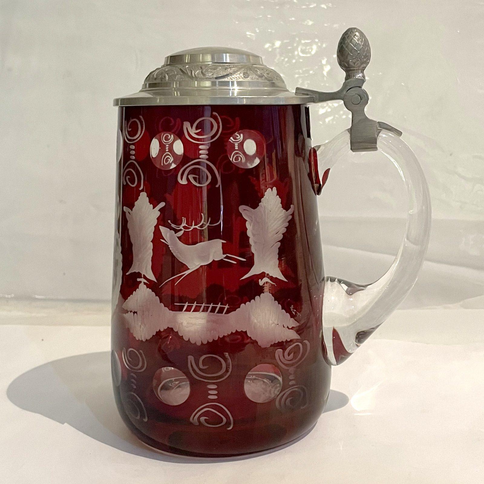 Egermann Glas Trinkkrug mit Zinndeckel antik böhmisches Glas rubinrot geschliffen Höhe ca. 16 cm