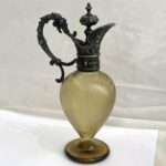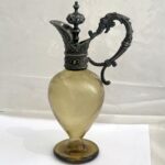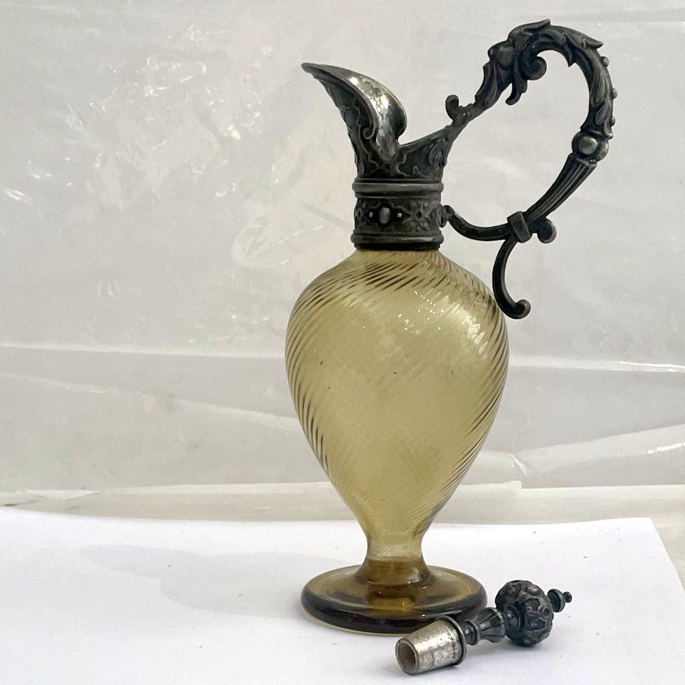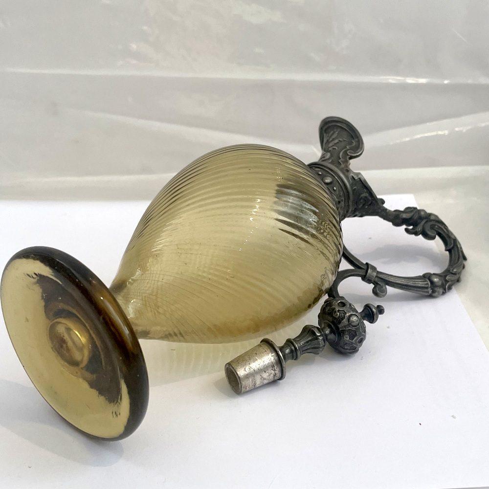 Antike Glas Kanne mit Abriss ca. 1920 Montierung Zinn Farbe Amber optisch mundgeblasen Höhe 19 cm Ø 7 cm