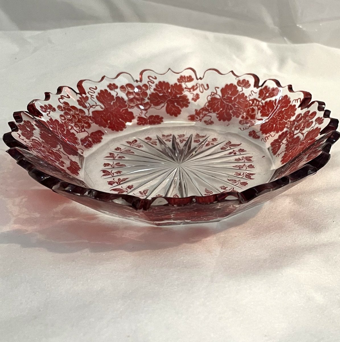 Antike Glasschale rot klar geschliffen mundgeblasen Durchmesser 17 cm Höhe 3,5 cm diese ist ein Unikat und deshalb besonders dekorativ. Die Schale kann beliebig gefüllt oder dekoriert werden, ebenso ist diese eine nette Geschenkidee
