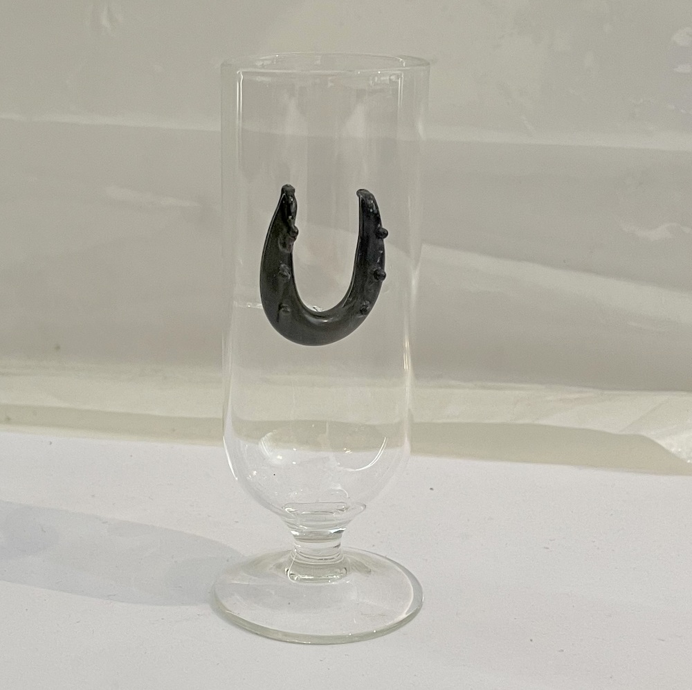 Schnapsglas Stamper mit schwarzem Hufeisen Höhe ca. 10 cm Klarglas mundgeblasen