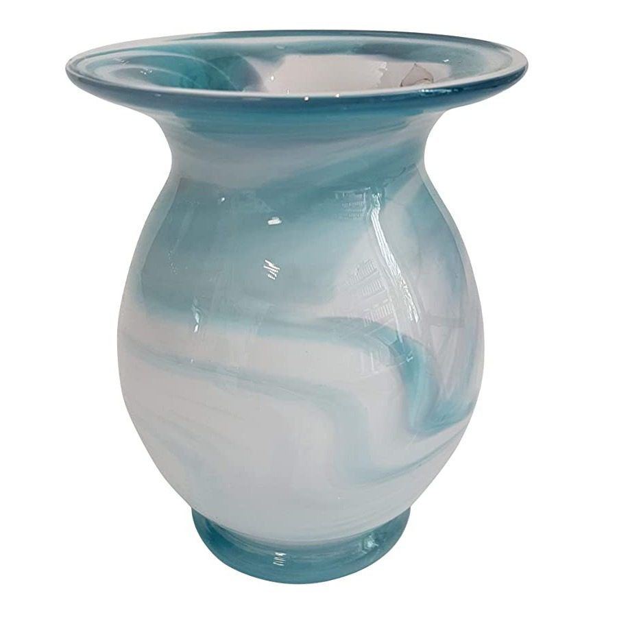 Diese schöne Glasvase in der Farbe türkis-weiß hat eine Höhe von ca. 15 cm. Die Vase ist mundgeblasen und deshalb ein Unikat. Die Blumenvase lässt sich sehr schön in Ihrem Wohnbereich dekorieren. Ebenfalls ist diese Vase eine schöne Geschenkidee. Die passenden Glasblumen finden Sie in unserem Online Shop.