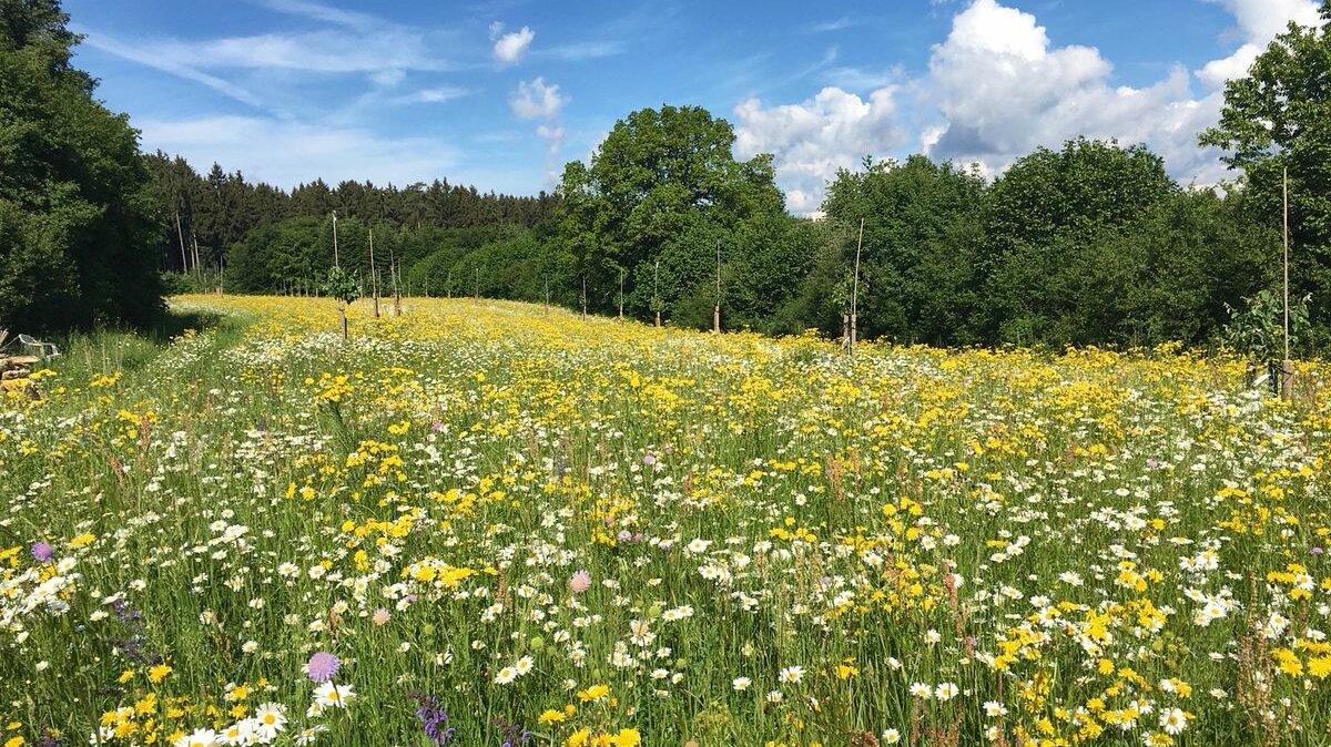 Diese Blumenwiese ist bunt blühend und sehr artenreich, bestehend aus niedrig bis hoch wachsenden Blumen, Unter-, Mittel- und Obergräsern. Sie erreicht eine Höhe von 80-100 cm vor dem ersten Schnitt. Im ersten Jahr dominieren Akzeptanzarten wie Kornblume und Klatschmohn das Bild. Im zweiten Jahr blühen Margeriten und Glockenblumen auf, später prägen Bocksbart, Witwenblumen und Flockenblumen das Erscheinungsbild der Wiese.
