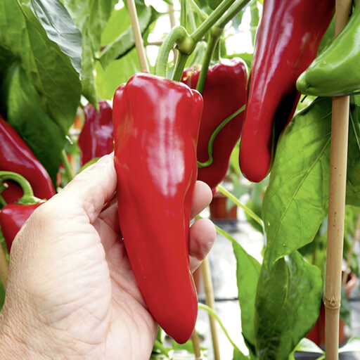 Hinweis: Einige Kunden berichteten 2021, dass die Früchte des hier als „meist mild“ beschrieben Brat Paprikas scharf bis sehr scharf waren. Durch einen eigenen Anbauversuch im Sommer 2025 können wir bestätigen, dass die Früchte zum Teil sehr scharf sind.