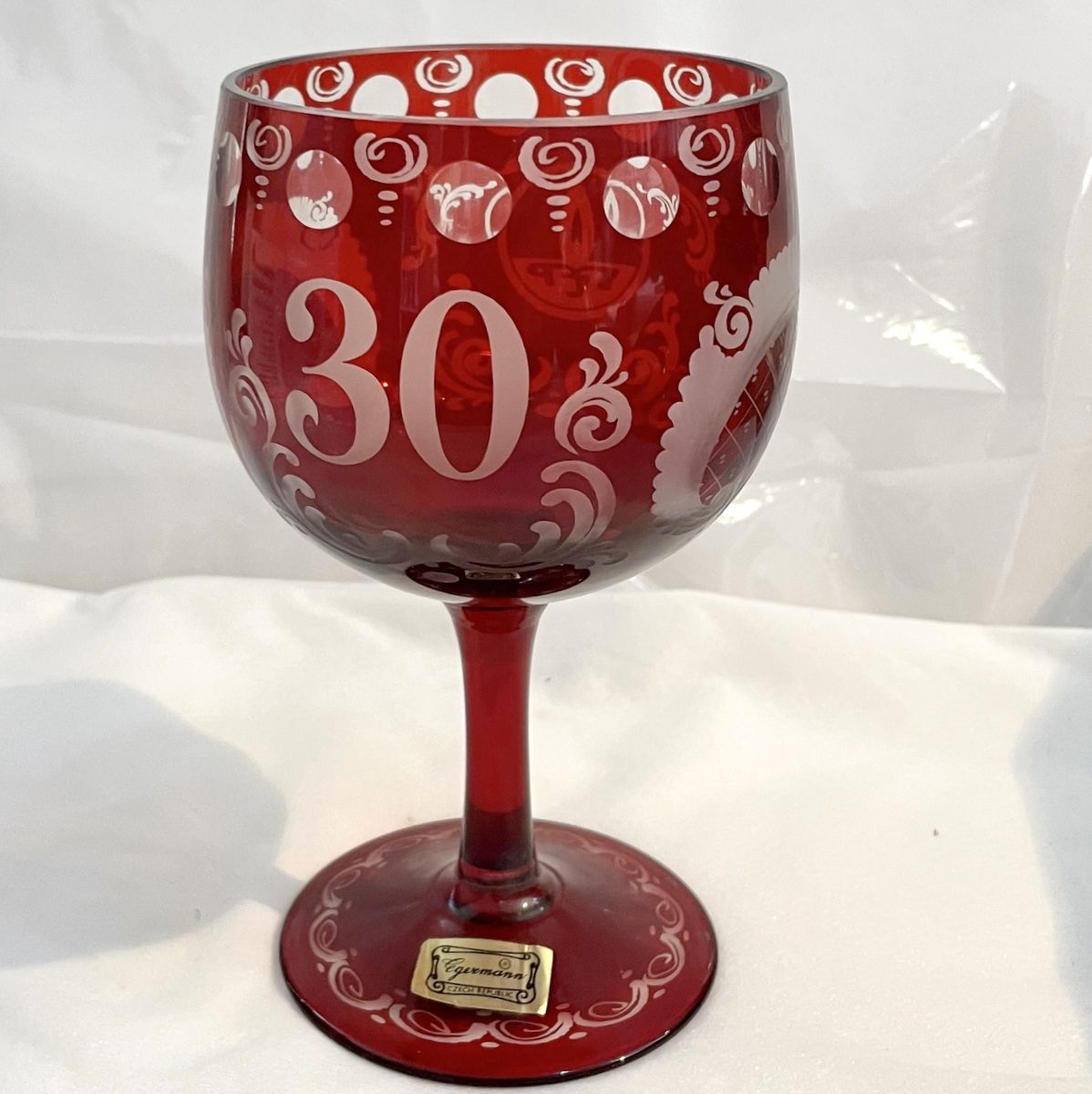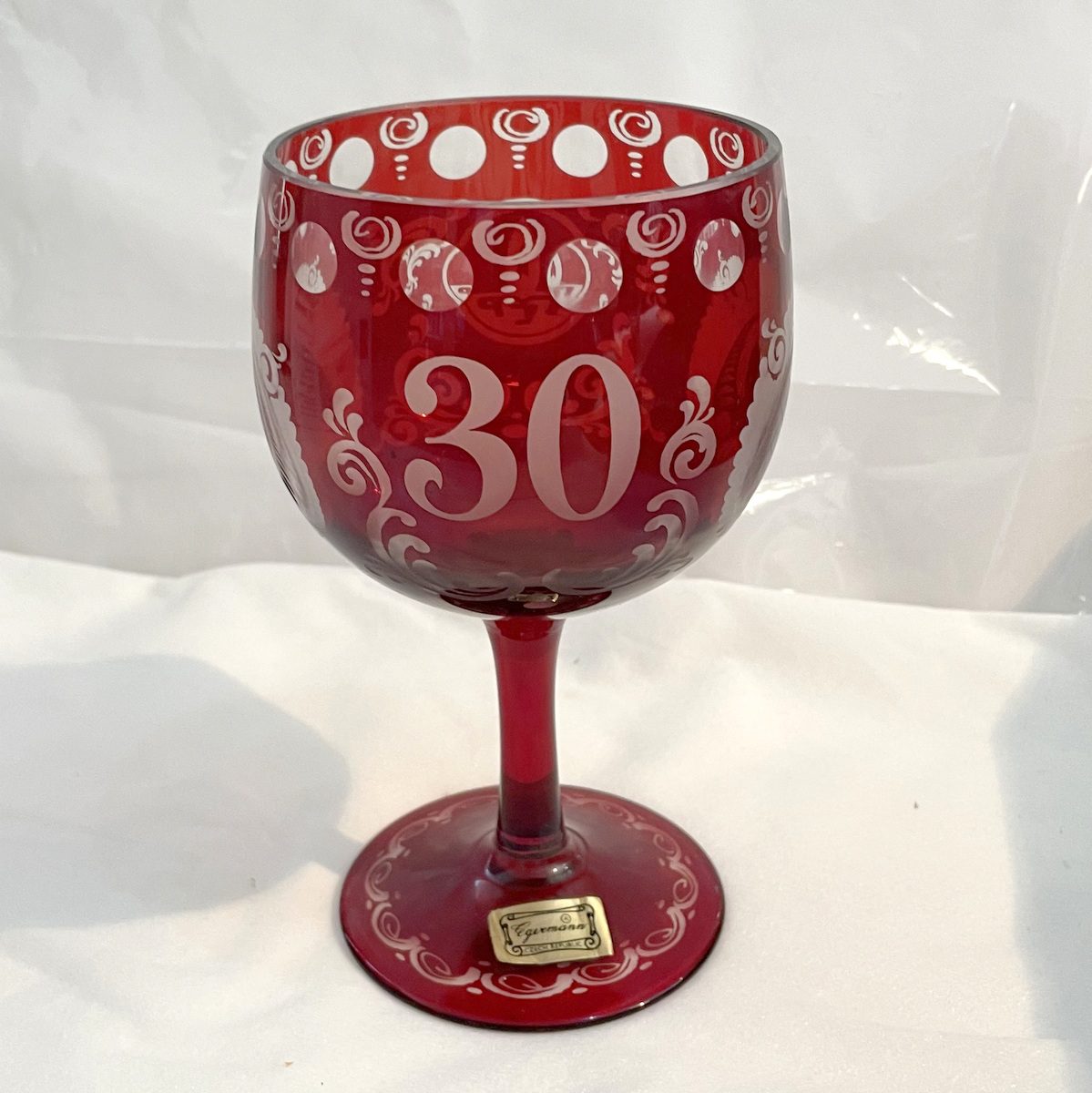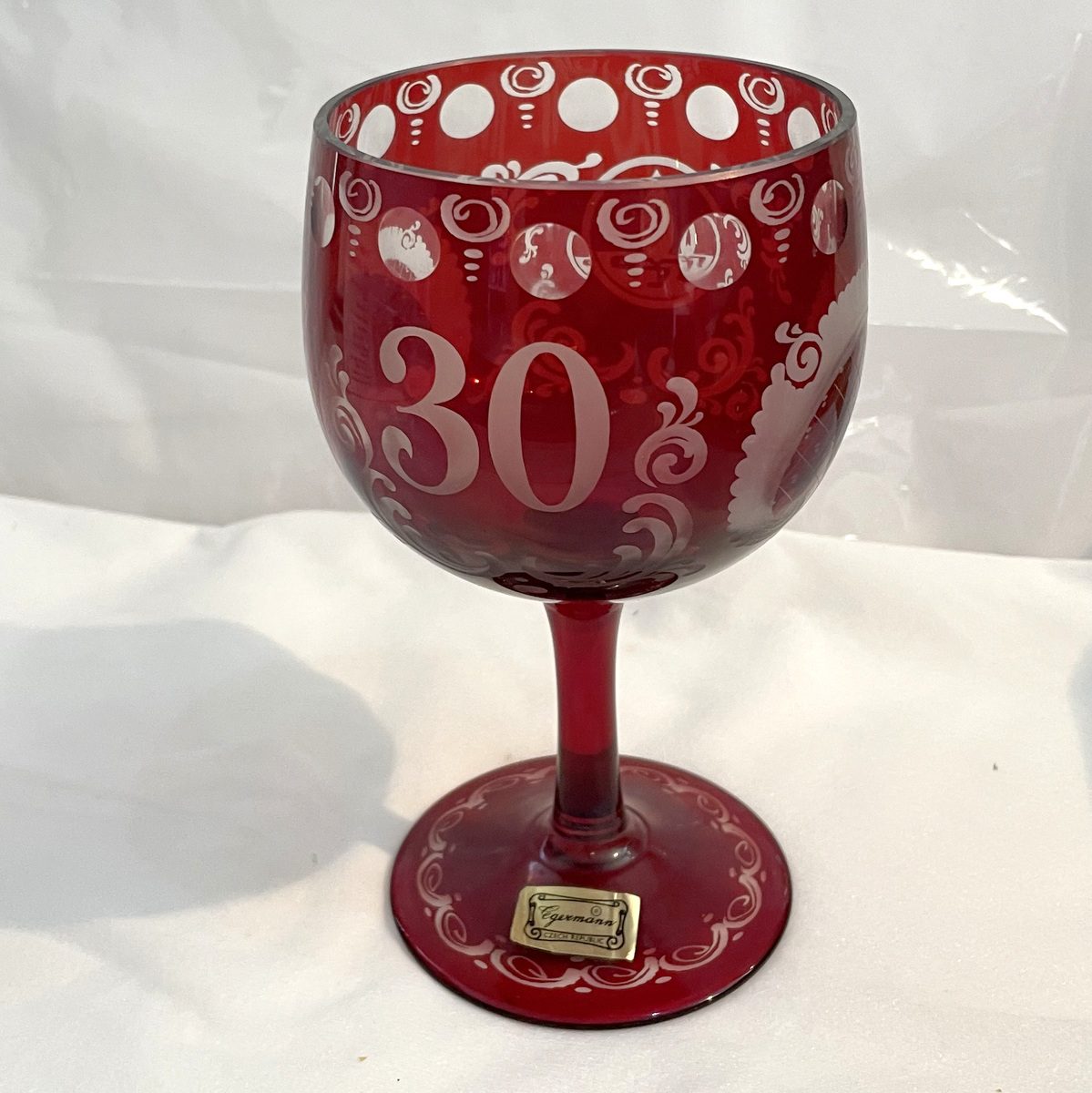 Dieses antike Weinglas der Firma Egermann mit der Zahl 30 hat eine Höhe von 16 cm und ist ein echtes Sammlerstück. Das Glas ist rubinrot und wurde von Hand geschliffen.