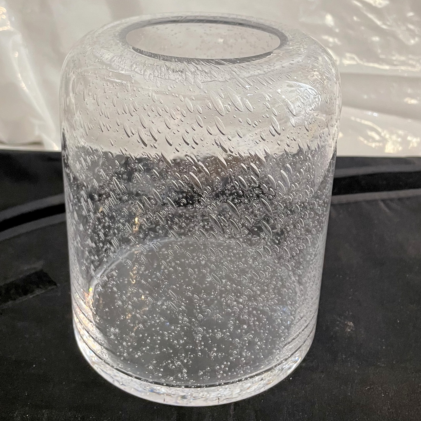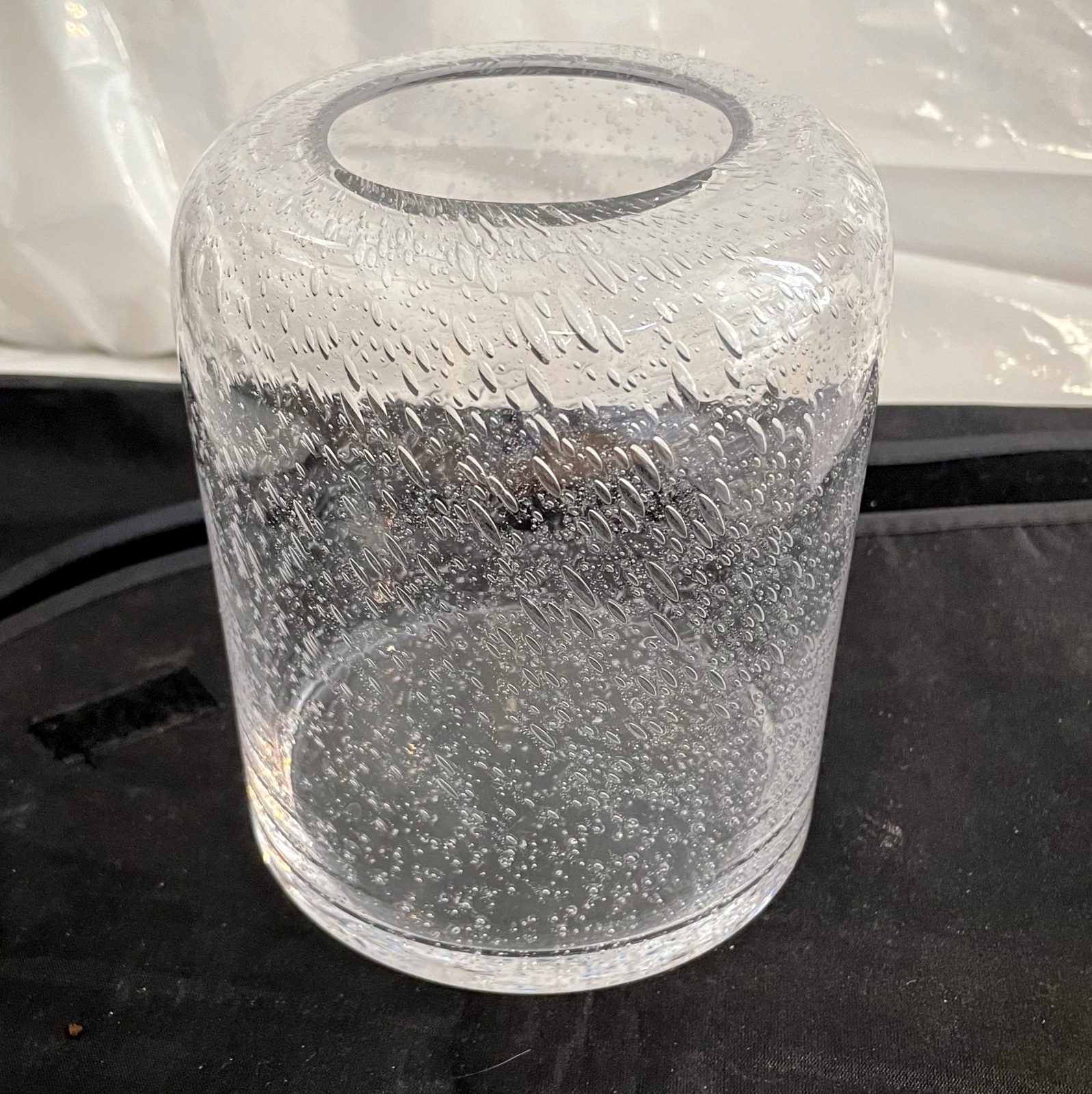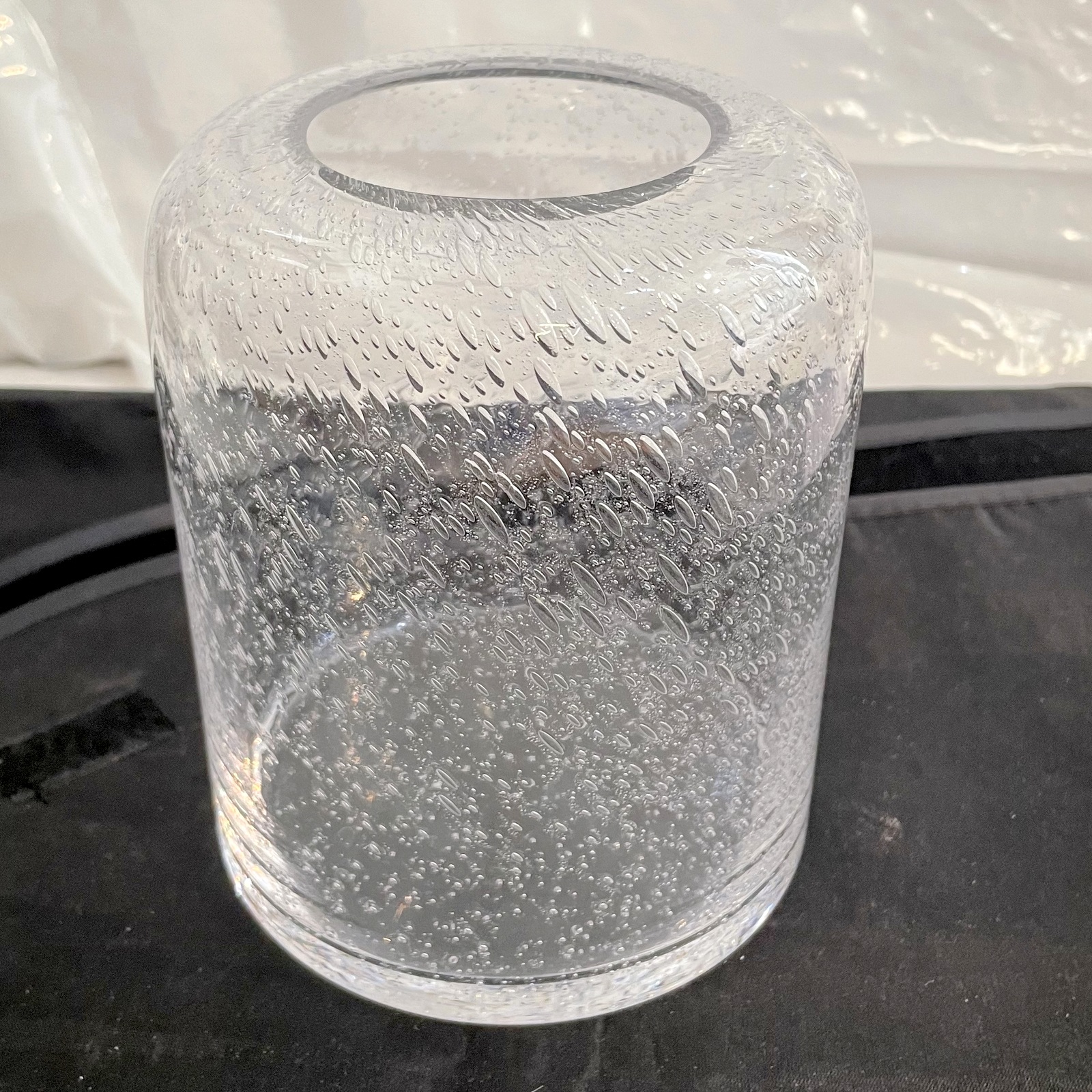 Klare Glas Vase zylindrisch mit Luftbläschen mundgeblasen Höhe ca. 15 cm Durchmesser ca. 12 cm mit einer Öffnung von ca. 6 cm Iris