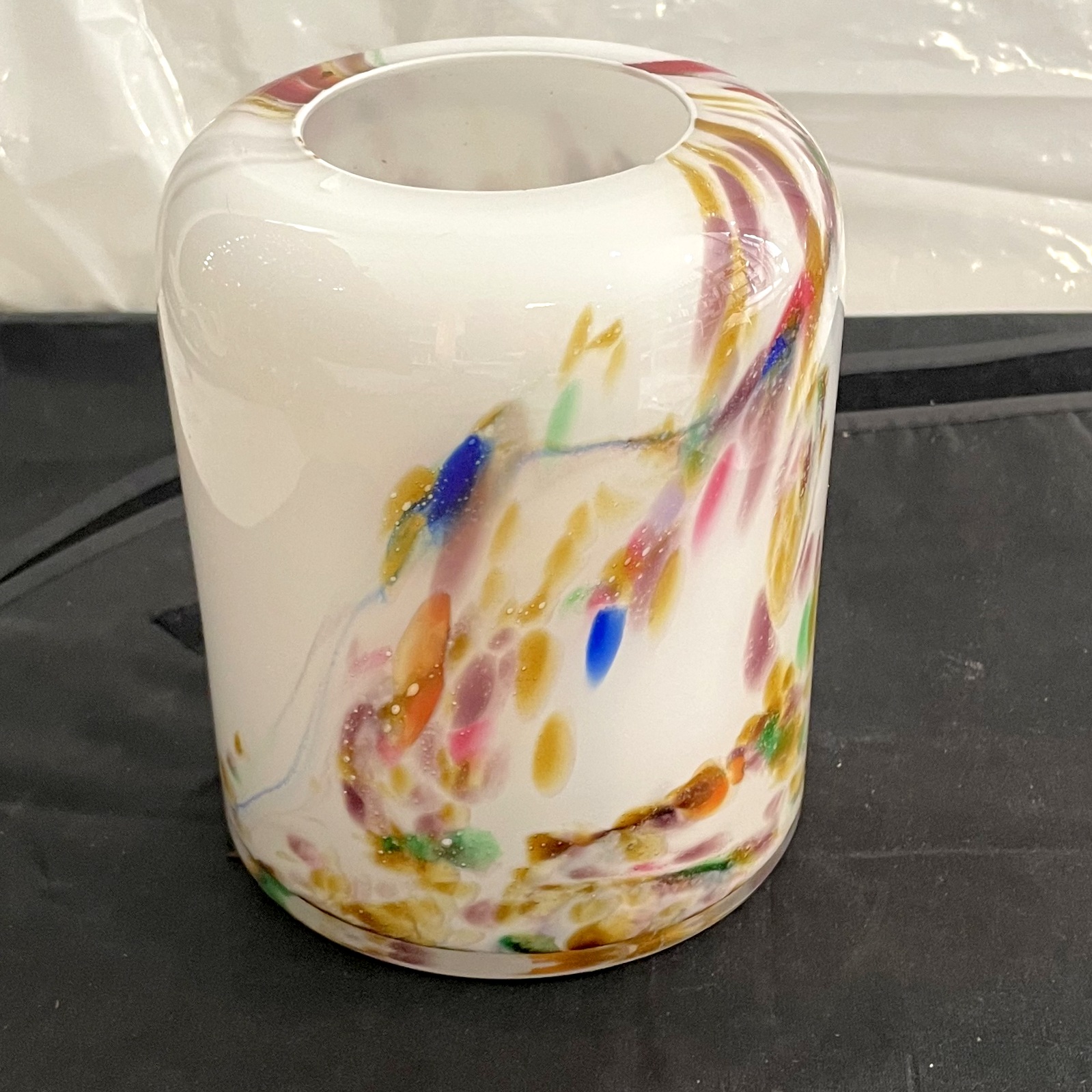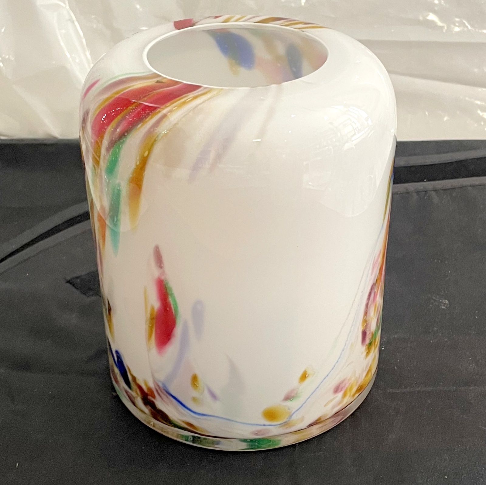Ein Meisterwerk der Glasbläserkunst! Glas Tulpen Vase zylindrisch Höhe ca. 15 cm Durchmesser ca. 12 cm mit einer Öffnung von ca. 6 cm, mundgeblasen weiß bunt Pastell Töne. Entdecken Sie weitere exquisite Stücke aus unserer Kollektion in unserem Onlineshop.