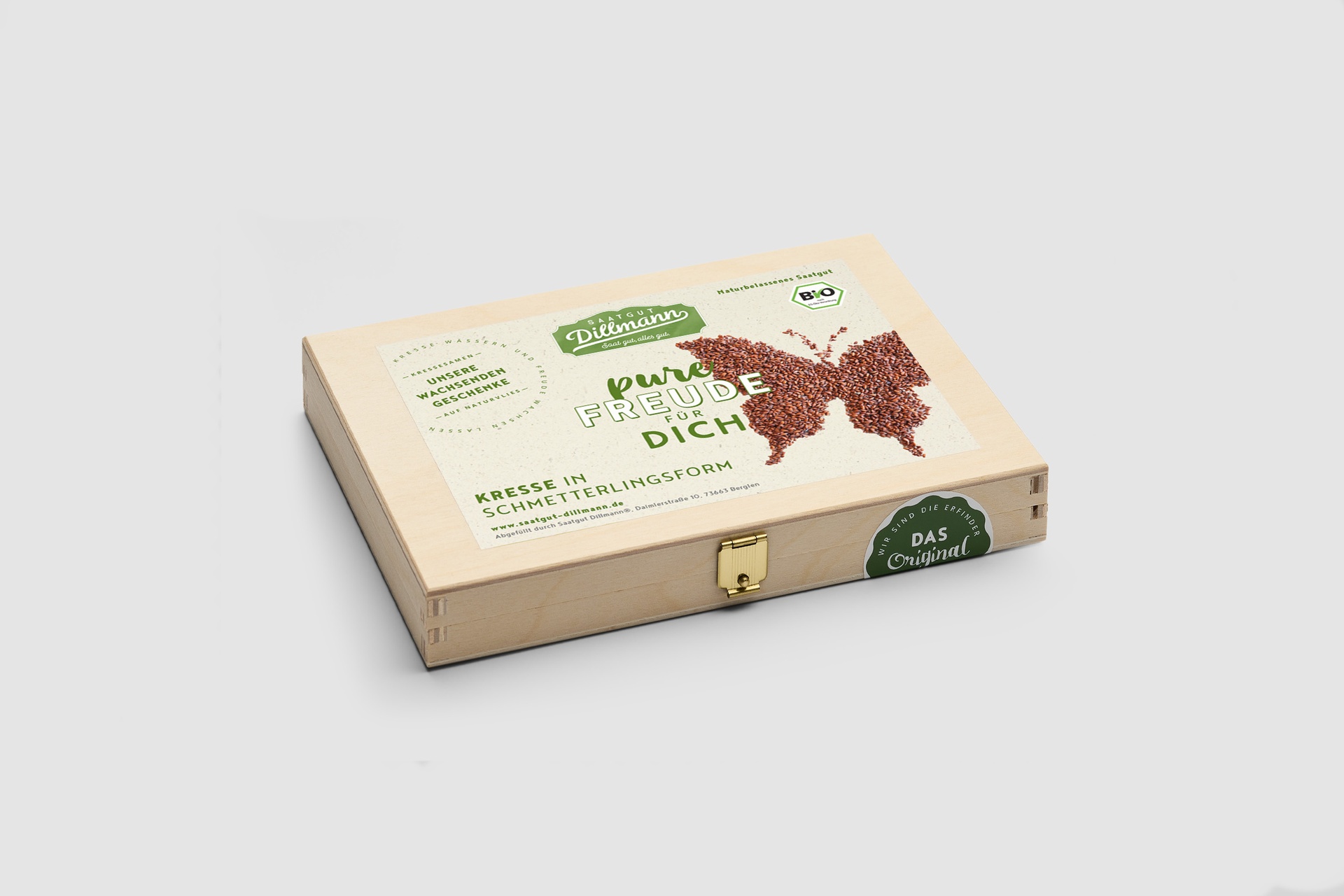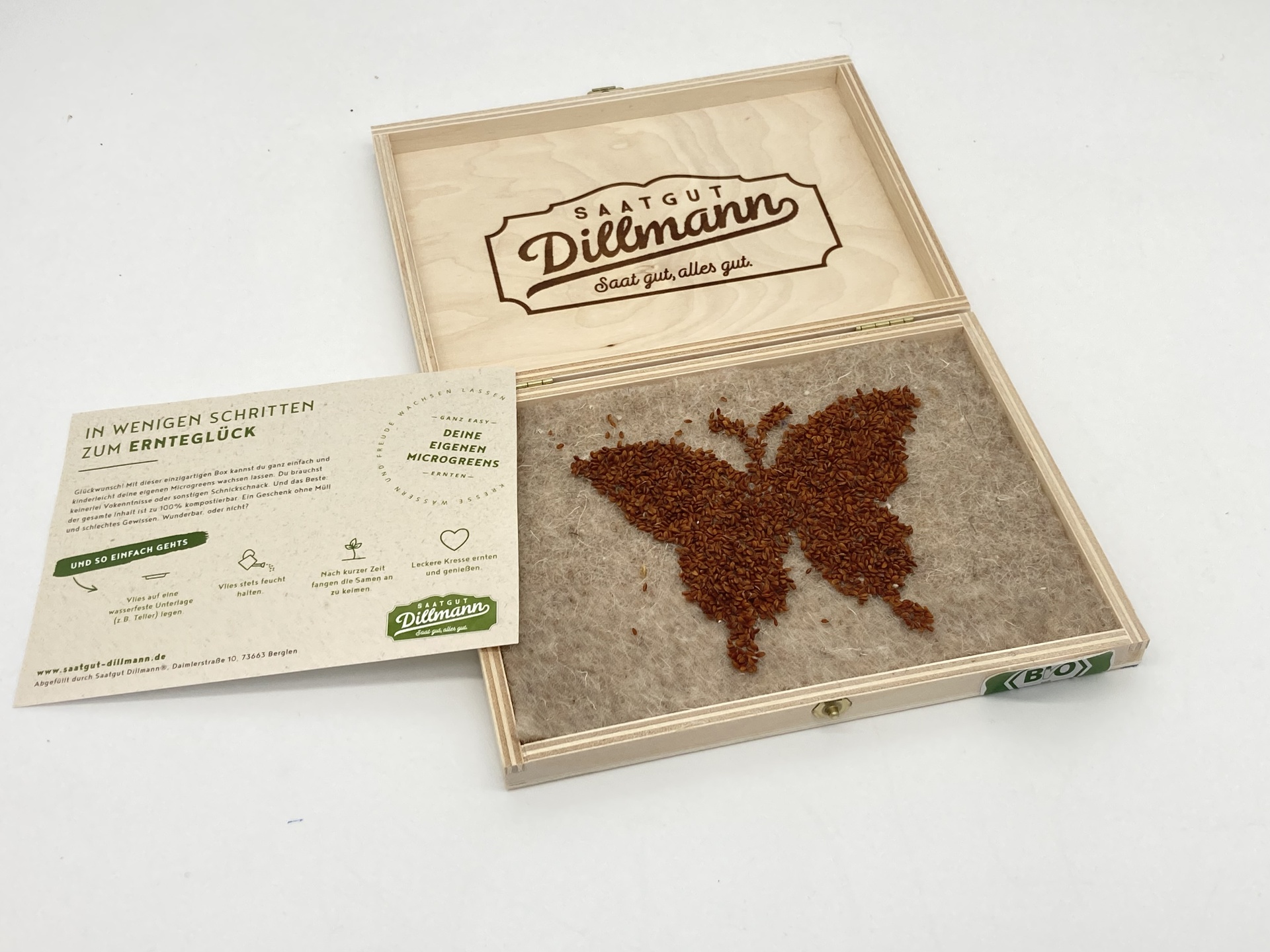 Die Holzbox enthält ein Vlies mit Kresse in Schmetterlingsform. Die gekeimte Kresse ergibt bereits nach wenigen Tagen einen erfrischenden Salat und schmeckt auch auf dem Butterbrot sehr lecker (mit etwas Zitronensaft, Kräutersalz und Pfeffer abgeschmeckt).