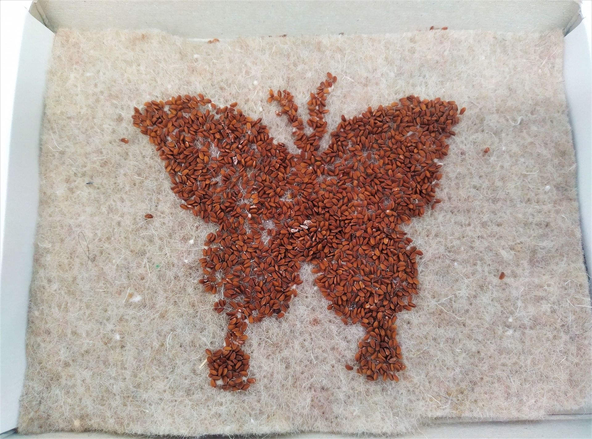 Der Karton enthält ein Vlies mit Kresse in Schmetterlingsform. Die gekeimte Kresse ergibt bereits nach wenigen Tagen einen erfrischenden Salat und schmeckt auch auf dem Butterbrot sehr lecker (mit etwas Zitronensaft, Kräutersalz und Pfeffer abgeschmeckt).