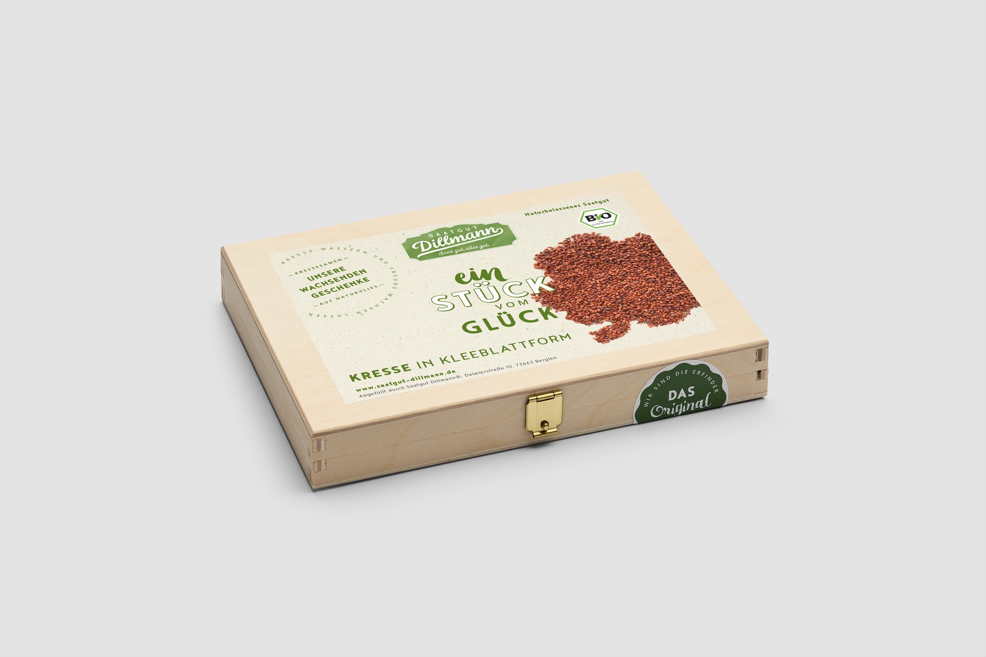 Die Holzbox enthält ein Vlies mit Kresse in Herzform. Die gekeimte Kresse ergibt bereits nach wenigen Tagen einen erfrischenden Salat und schmeckt auch auf dem Butterbrot sehr lecker (mit etwas Zitronensaft, Kräutersalz und Pfeffer abgeschmeckt).
