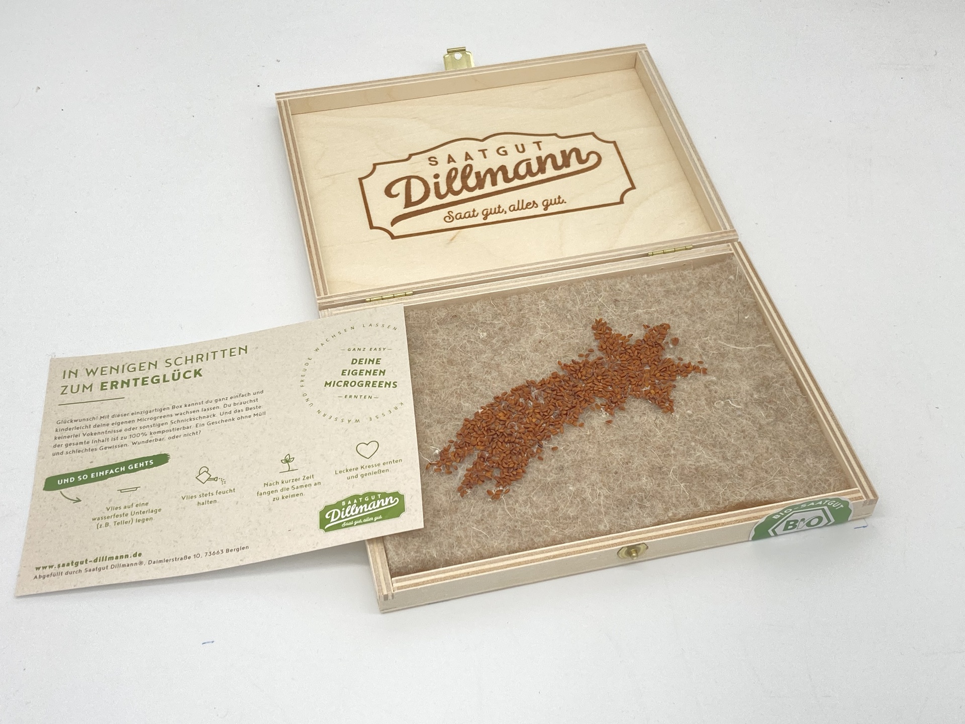 Naturvlies auf wasserfeste Unterlage (Bsp. Teller) legen und bis zur Ernte stets feucht halten,