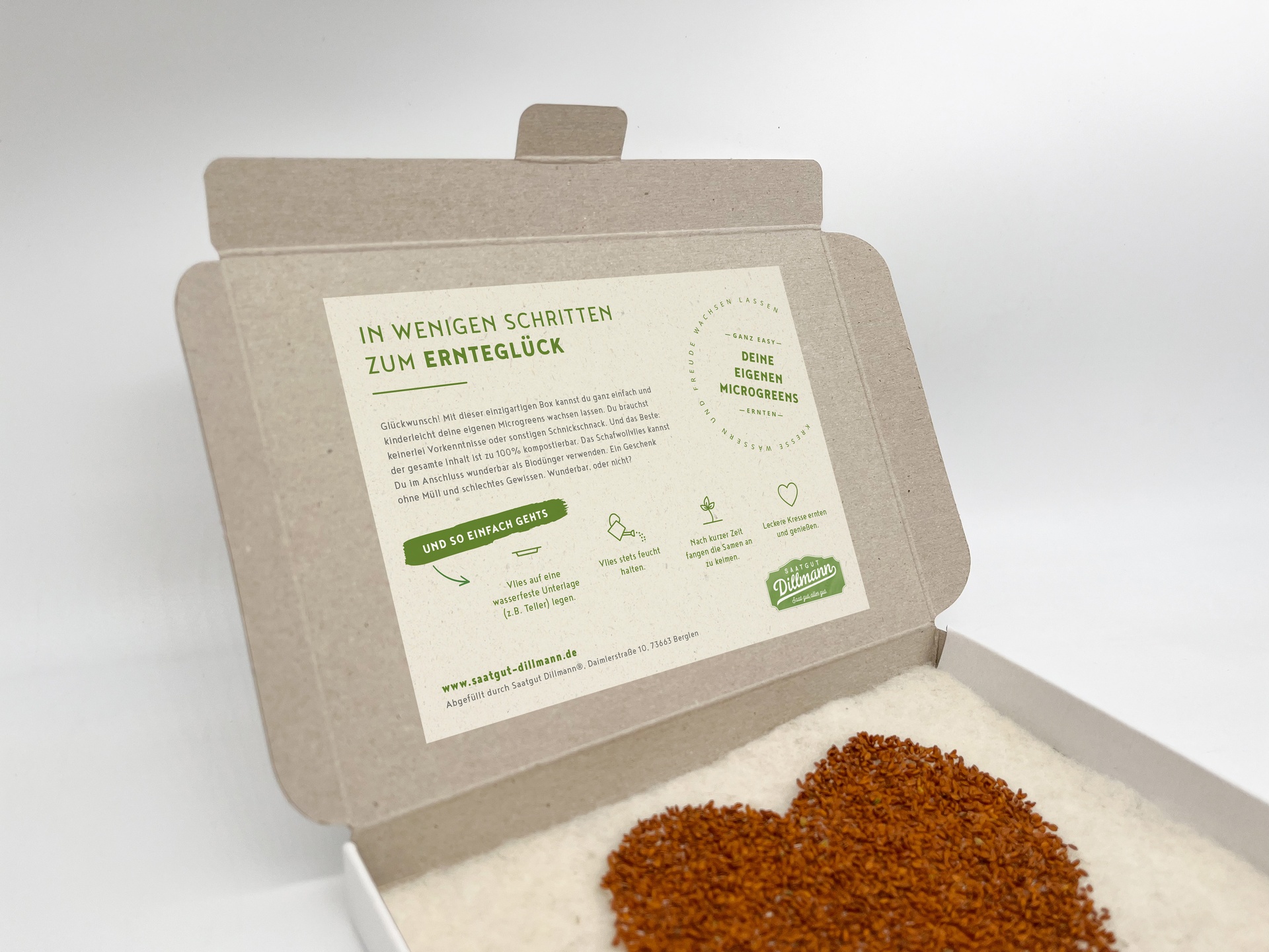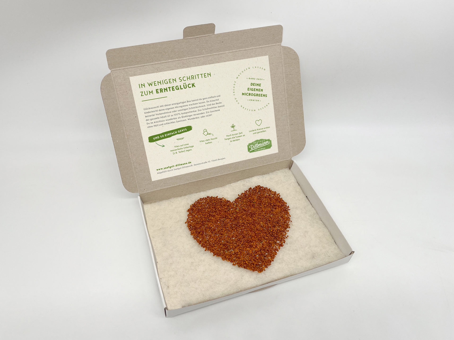 Die Kartonbox enthält ein Vlies mit Kresse in Herzform. Die gekeimte Kresse ergibt bereits nach wenigen Tagen einen erfrischenden Salat und schmeckt auch auf dem Butterbrot sehr lecker (mit etwas Zitronensaft, Kräutersalz und Pfeffer abgeschmeckt).