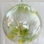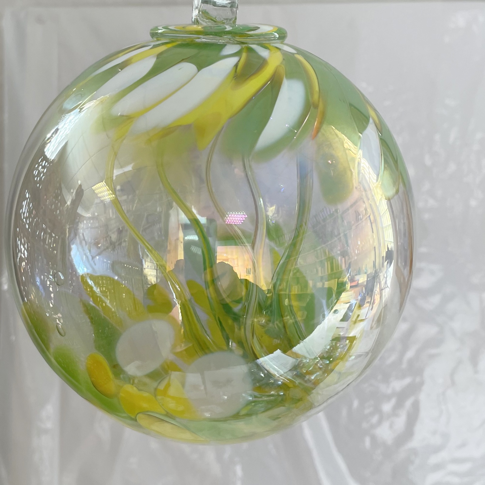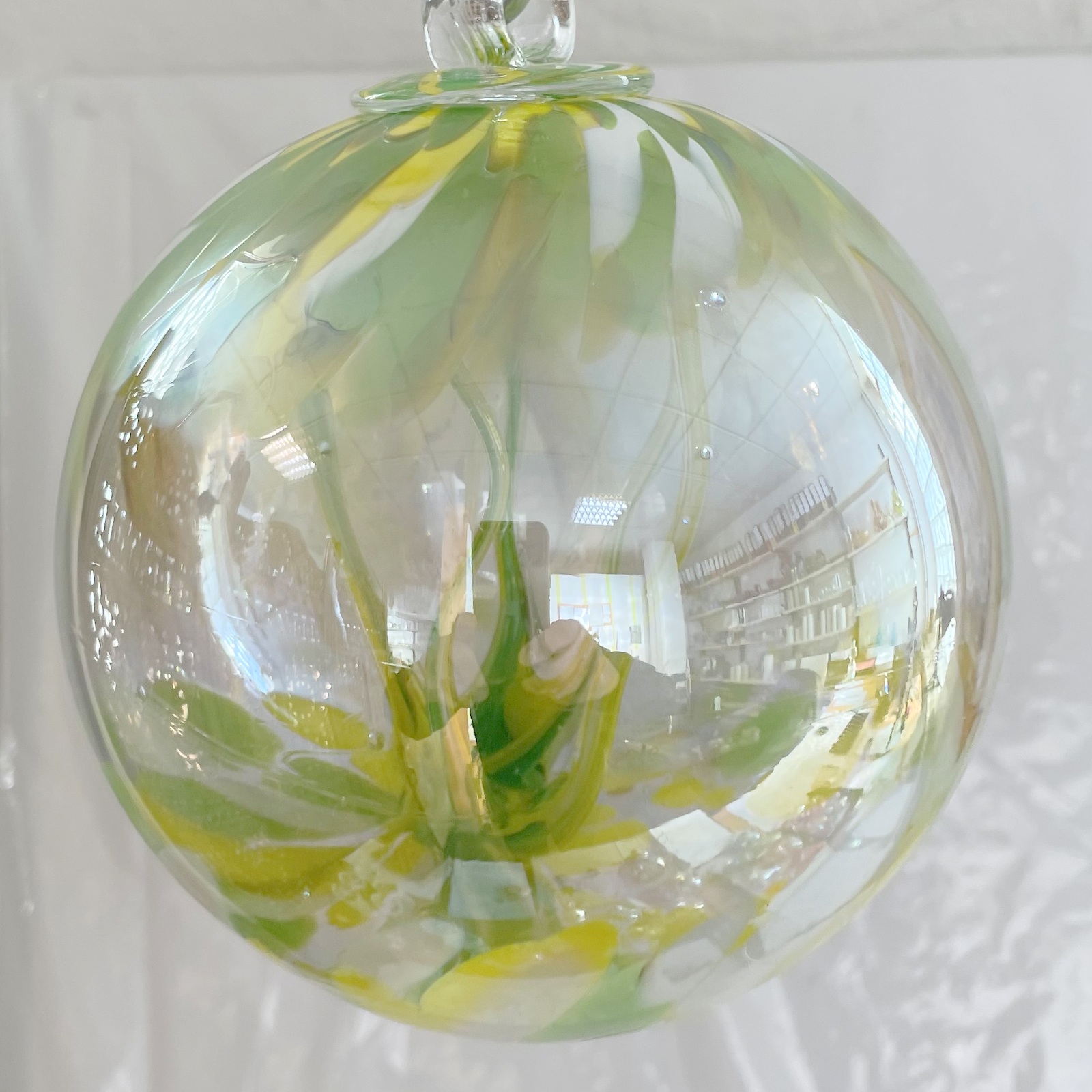 Kugel zum hängen mit Innenleben bunte Glaskugel Ornament grün gelb weiß klar irisierend Fensterdekoration mundgeblasenes Kristallglas Durchmesser ca. 15 cm