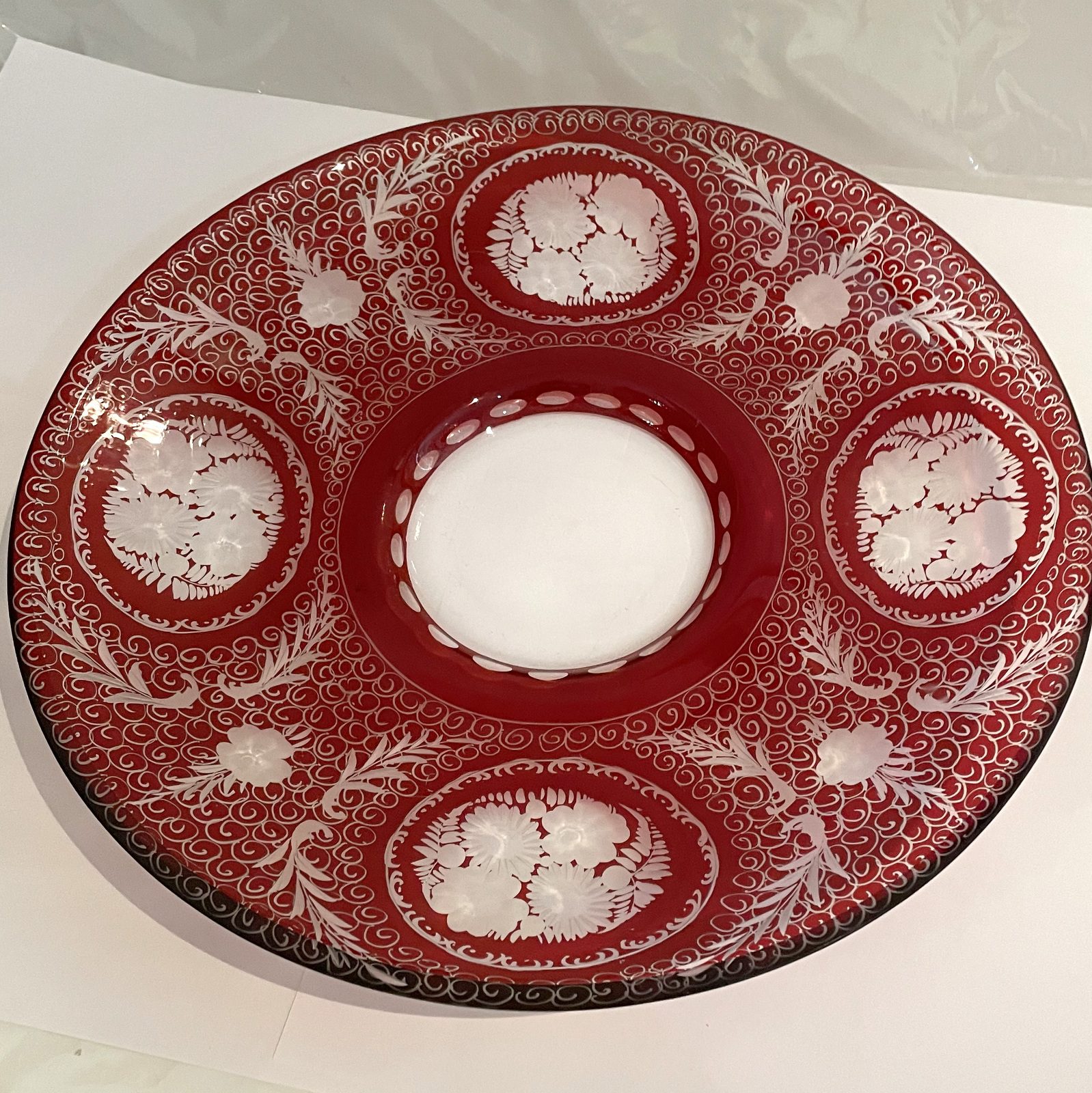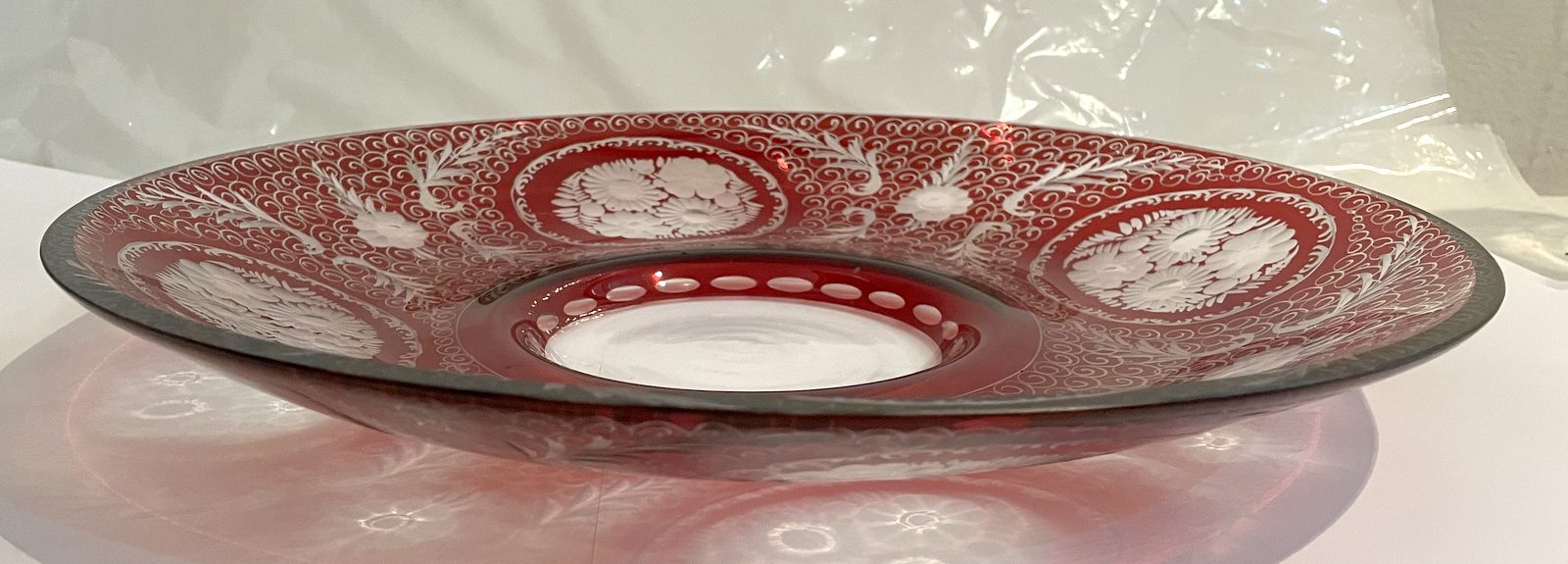Original Egermann antik Glas böhmische Glas Teller Schale mit sehr feinem Schliff rubinrot Höhe ca. 4,5 cm und Durchmesser 34 cm