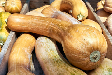 Essbarer Butterkürbis aus Frankreich mit bis 30 cm langen, keulenförmigen Früchten.
