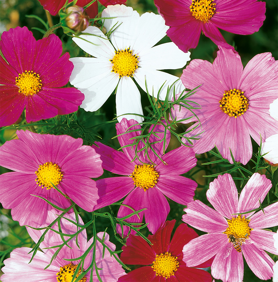 Feingefiederte, kräftig verzweigte Pflanzen mit großen Blüten in Rot- und Weißtönen. Wunderschön anzuschauen in Sommerblumen- und Staudenbeeten. Höhe ca. 70 bis 120 cm.