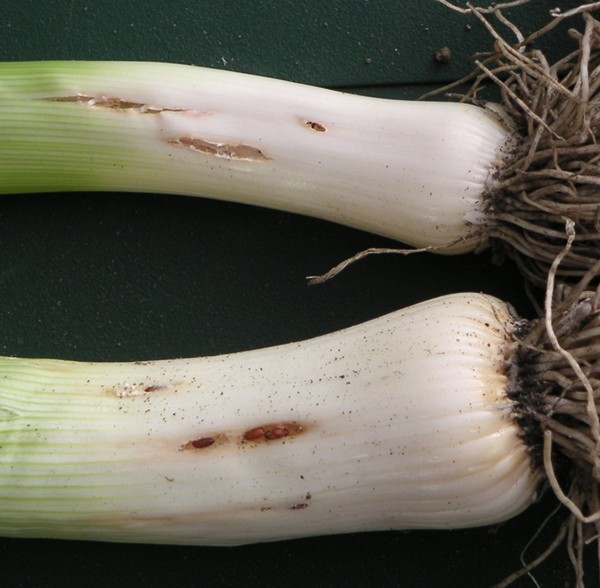 Bild 1: Äußerlich erkennbarer Befall von Lauchminierfliege.