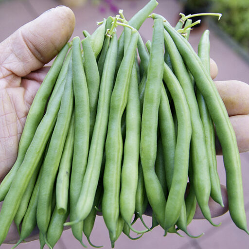 Hülsenlänge ca. 24 cm, Hülsenbreite ca. 13 mm. Ertragreich, robust und anbausicher. Die tiefgelben, runden Hülsen sehen nicht nur sehr schön aus, sondern schmecken auch besonders lecker.