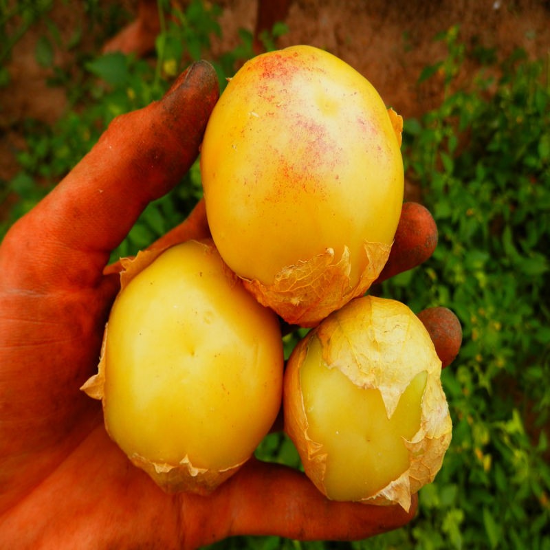 Hat für eine Tomatillo süße, gelbe, bis mandarinengroße Früchte. Diese lassen sich hervorragend für Soßen verwenden, in der Pfanne braten oder vollreif roh naschen. Klassisch werden sie zusammen mit Chilis zur Herstellung von Salsa benutzt. Schöne Jungpflanze mit saftigem Grün und ersten Blütenansätzen schon im Topf. Deutlich früher reif als vergleichbar ertragsstarke Sorten.