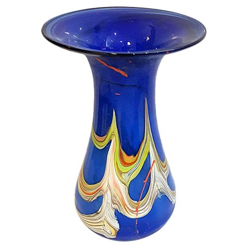 bauchige Vase mundgeblasen aus Glas große Blumenvase farbig verziert blau beige weiße Glasvase bunt Dekoration für Wohnräume modern Vase ausgefallenes besondere Geschenkidee
