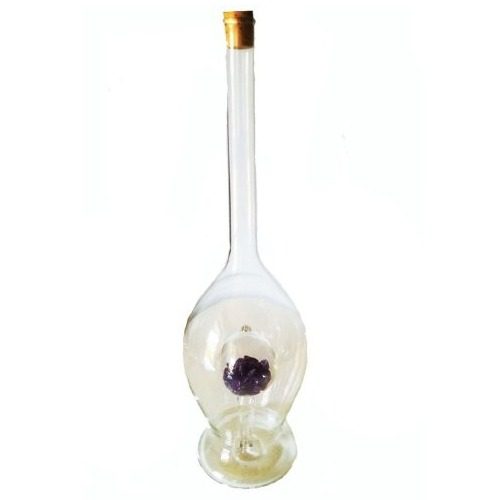Diese mundgeblasene Glasflasche enthält den Halbedelstein Amethyst reinigt Körper und Seele. Die Steine sehen im inneren der Flasche sehr schön aus, bei befüllter Flasche kommen diese noch mehr zur Geltung. Die Flasche hat eine Höhe von ca. 24 cm und eine Füllmenge von 0,33 Liter. Man sagt den Steinen nach das sie enorme Heilkraft besitzen.